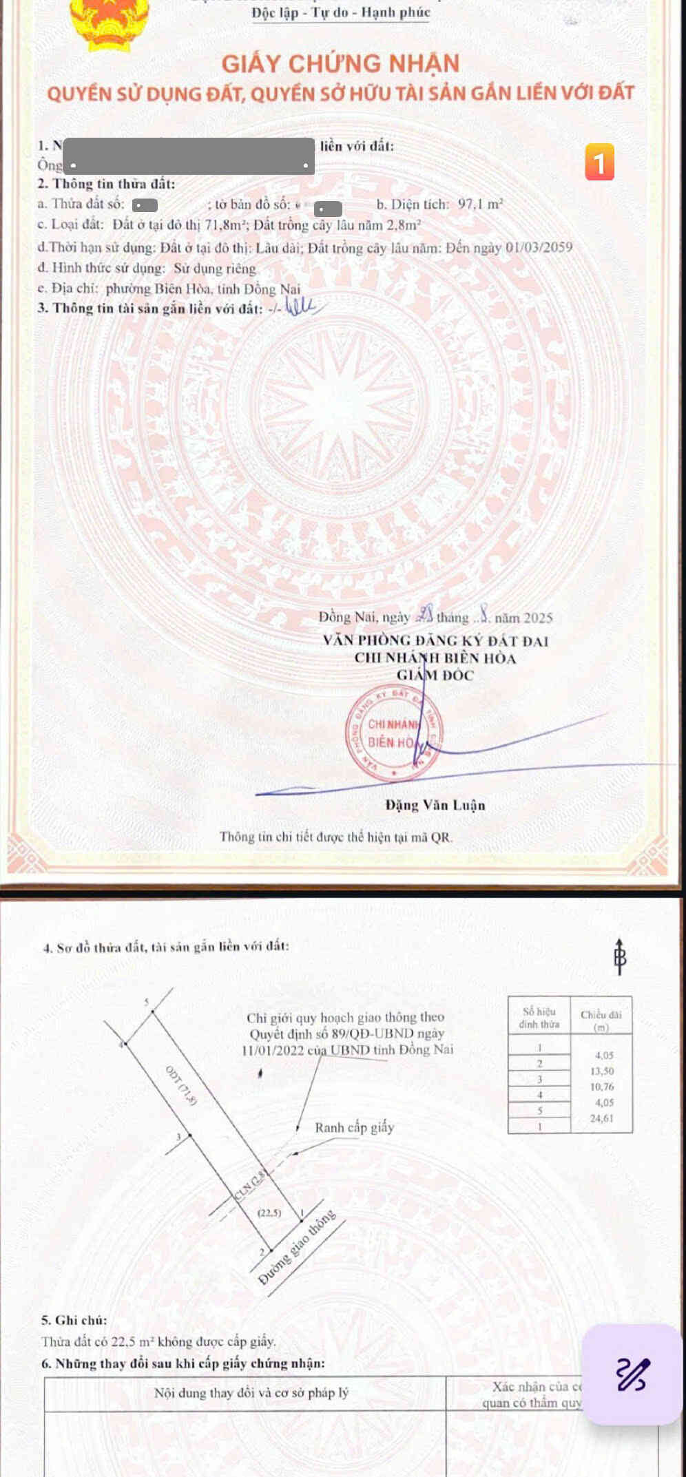 – Diện tích: 1497m2(13x98m), thổ cư 160m2, lộ giới vào 65m2