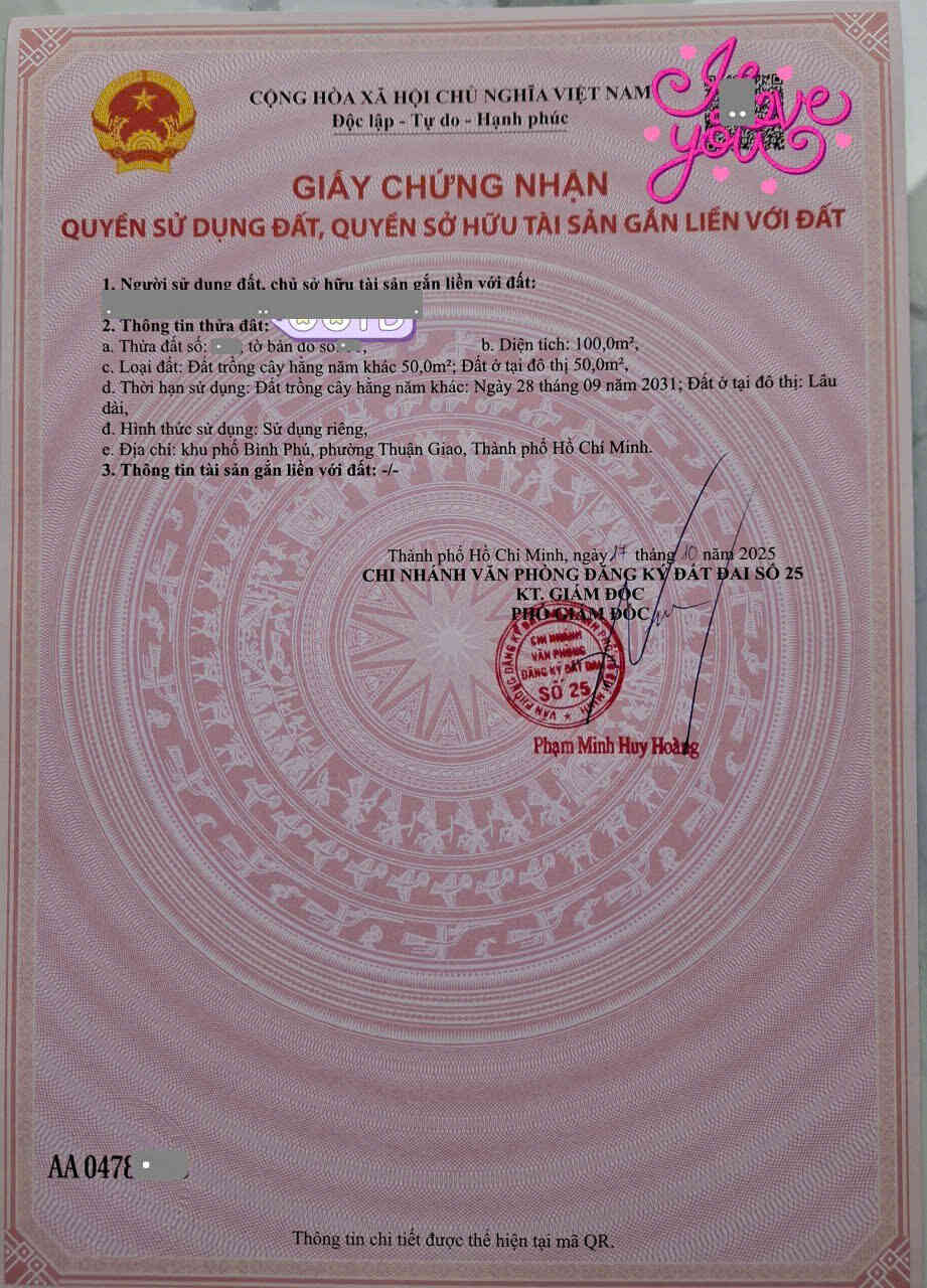 – Diện tích: 100m2(5x20m), thổ cư 50m2, đất không bị lộ giới